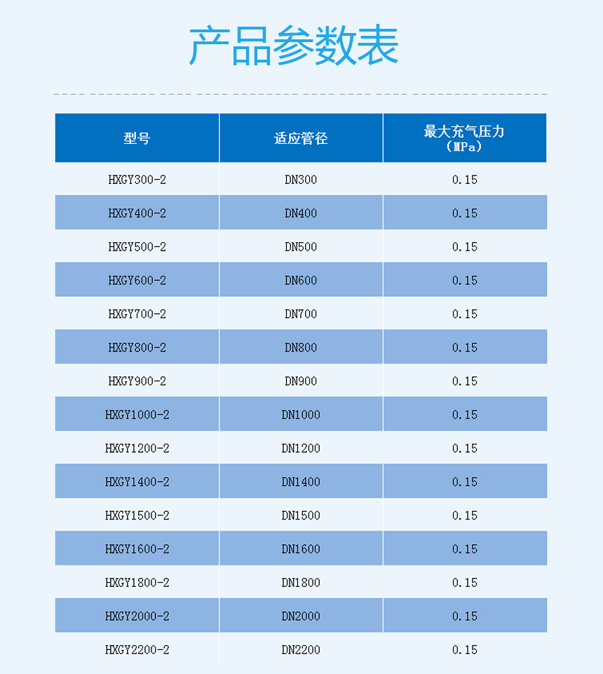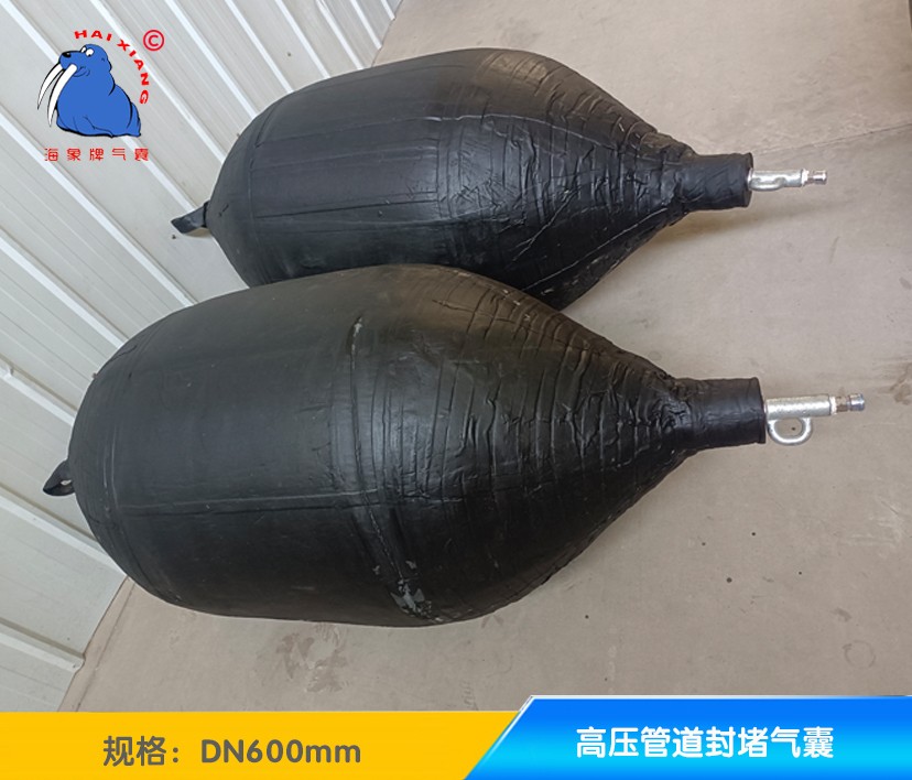 高压气囊的规格范围为DN300mm-DN3500mm,加强压力为0.15MPa和0.2MPa。气囊承受高压,保证了管道堵水后下游施工人员的人身安全。交付前,将在1.5倍额定工作压力和相应管径的条件下对每个管道堵水气囊进行测试。为了保证管道堵水气囊结构的强度,我们采用了三倍于管道堵水气囊额定工作压力的安全系数。